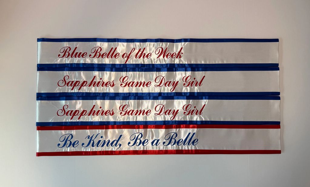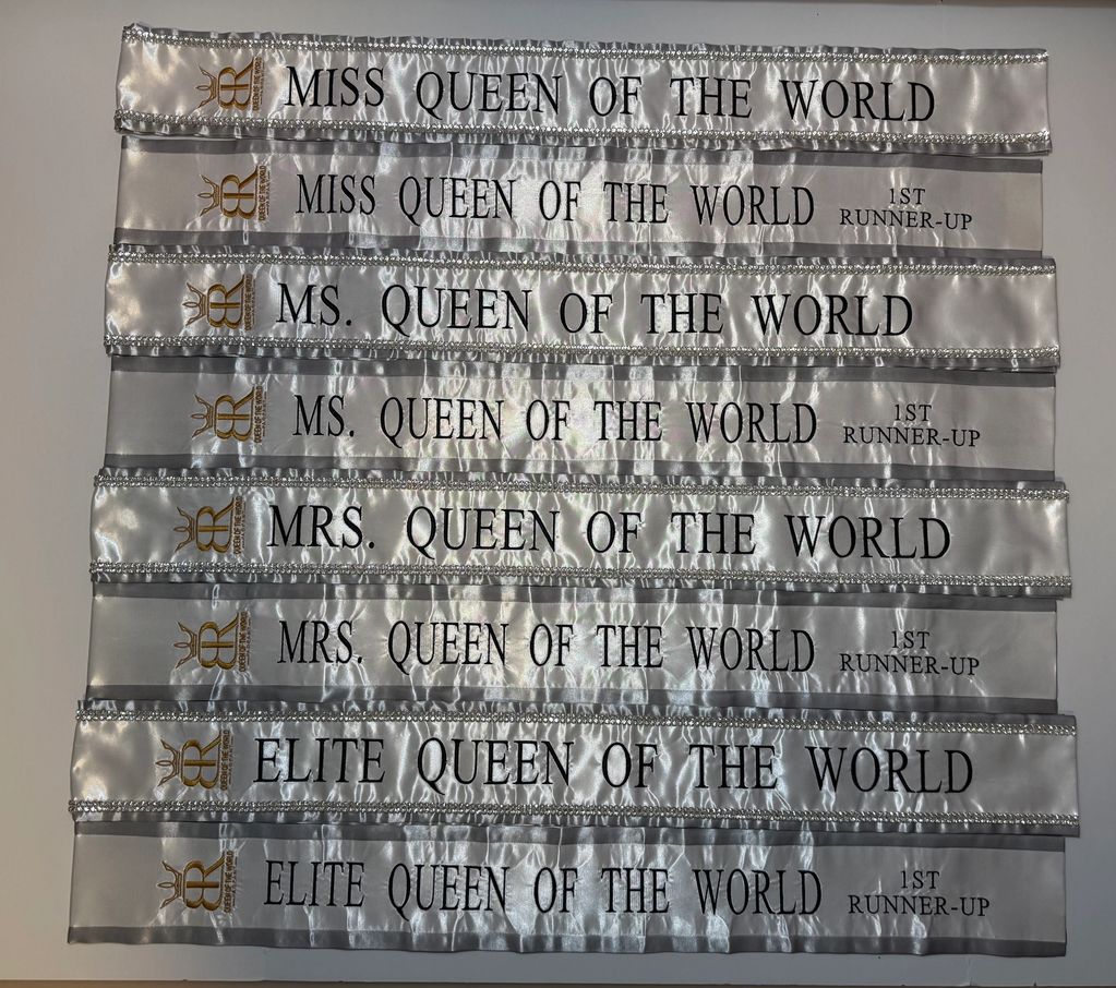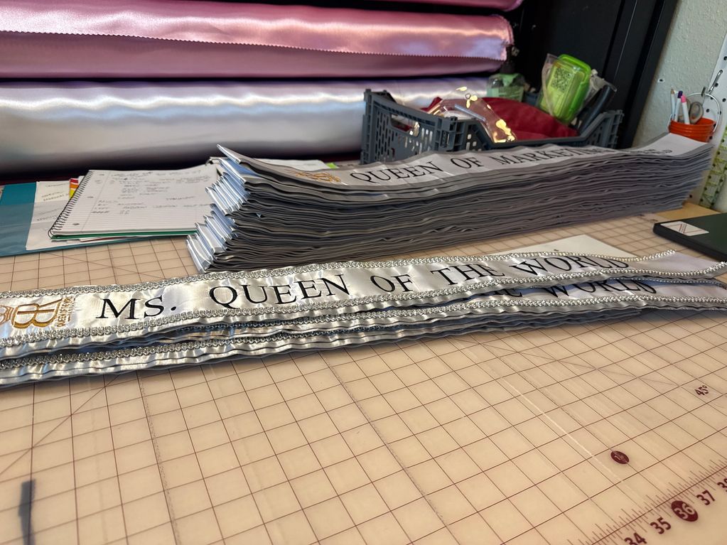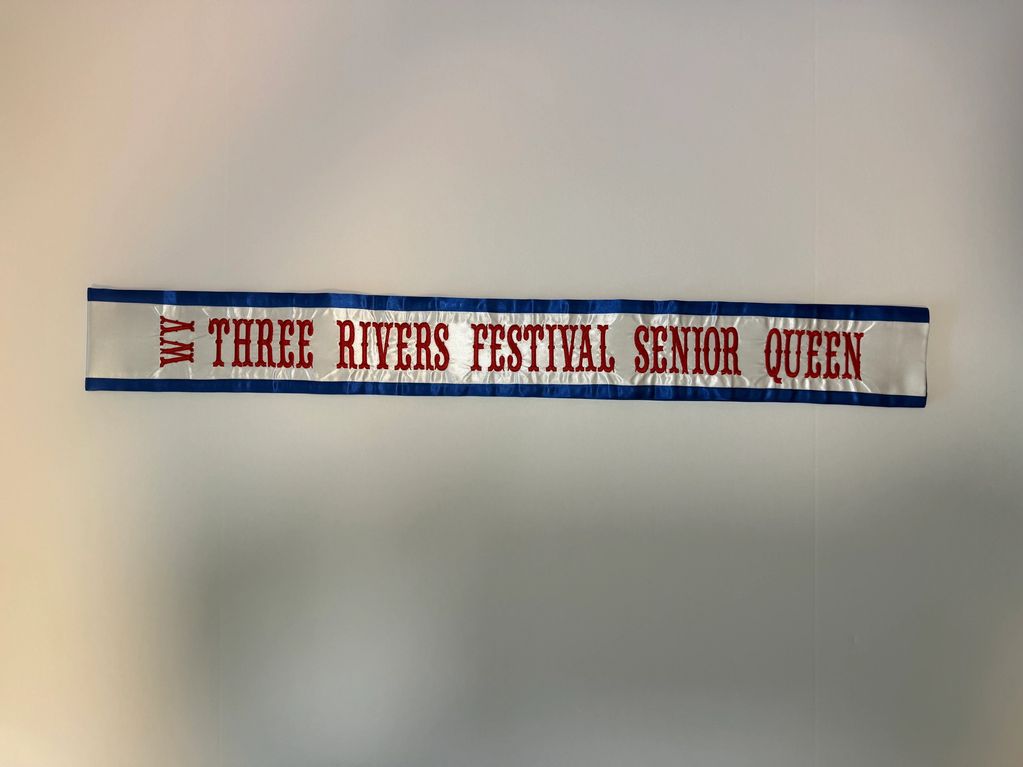 Additional sashes: White center, silver wraparound, custom logo at shoulder in old gold stitching, title in black stitching in Times Roman font, additional text on two lines below title.