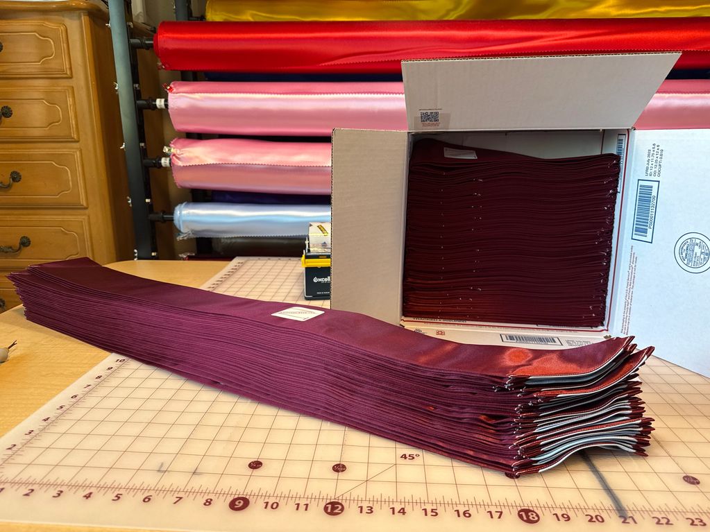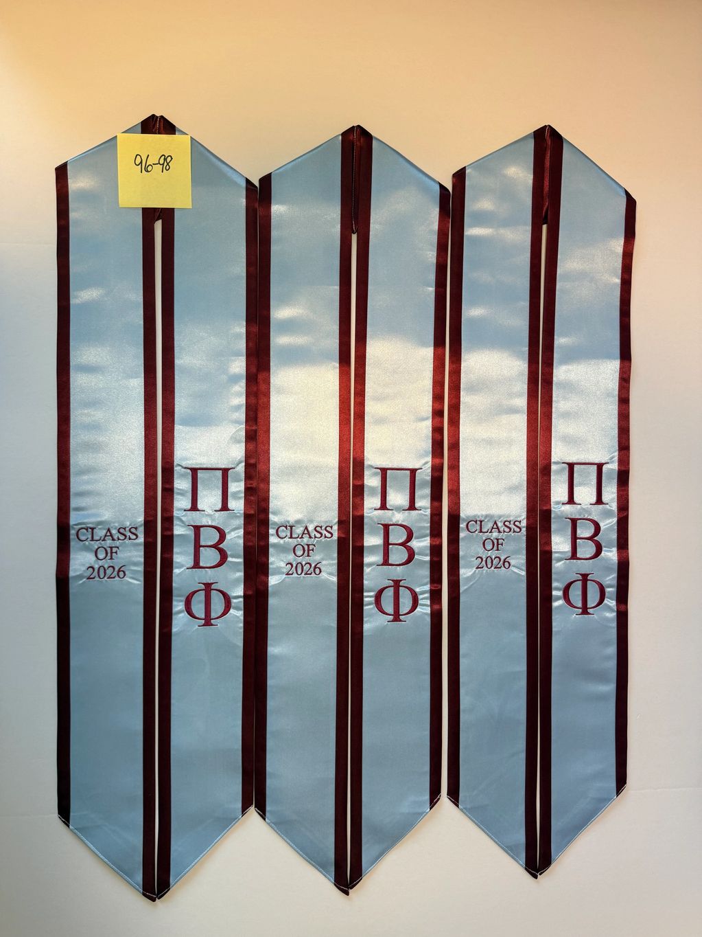 98 stoles: light blue center, burgundy wraparound, burgundy stitching in Times Roman font, pointed tips.